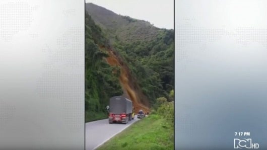Durante los deslizamientos, una camioneta, una tractomula y una moto se detuvieron de forma prudente ante el deslizamiento de la tierra y evitaron un accidente.