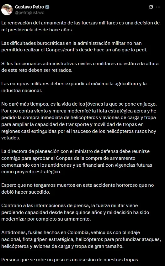 Minutos después, se pronunció el presidente Gustavo Petro: “La renovación del armamento de las fuerzas militares es una decisión de mi presidencia desde hace años”.