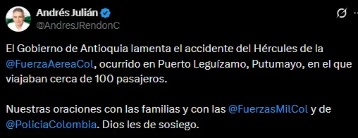 “El Gobierno de Antioquia lamenta el accidente del Hércules de la Fuerza Aérea, ocurrido en Puerto Leguízamo, Putumayo; en el que viajaban cerca de 100 pasajeros”, estas fueron las palabras del gobernador Andrés Julián Rendón.