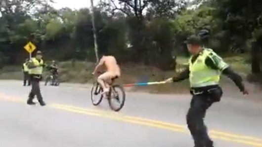 Las imágenes muestran cómo el ciclista sin ropa se pasea por algunas vías principales del departamento y evade los intentos de las autoridades por detenerlo.