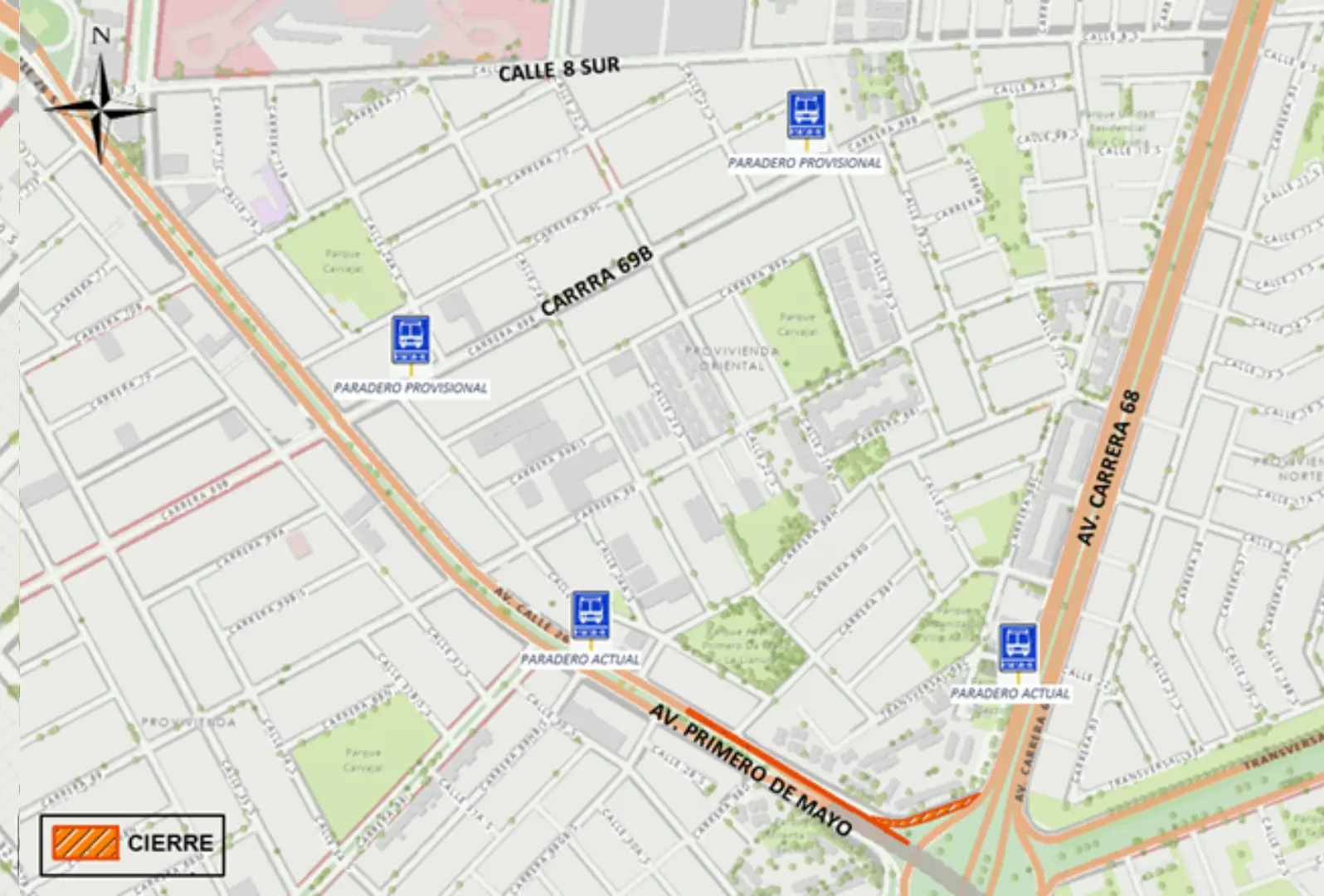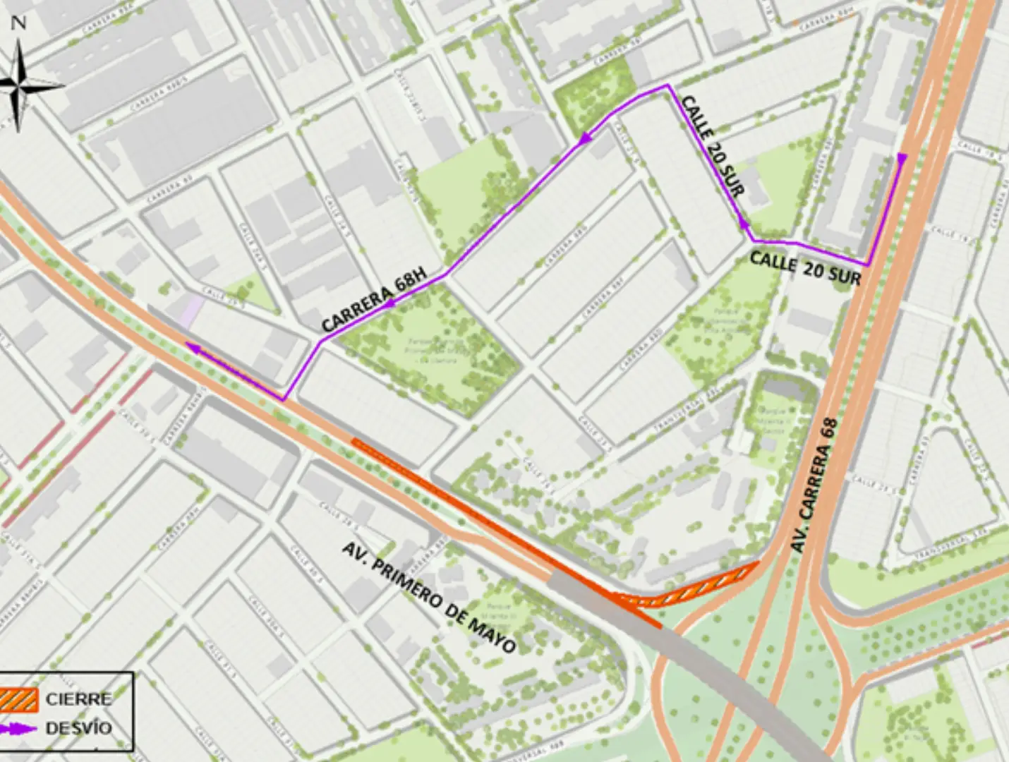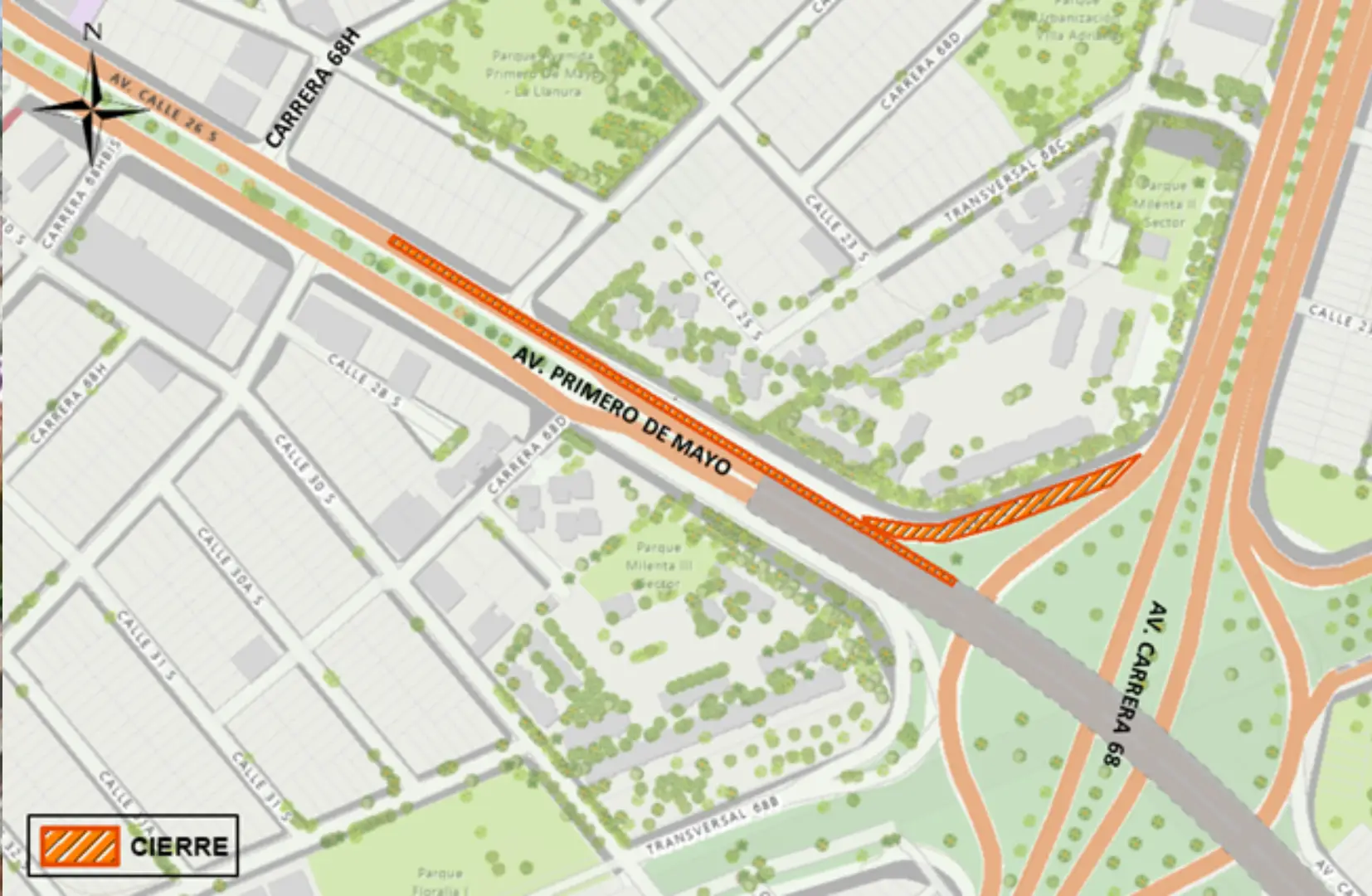Por causa de los avances que han tenido las obras del Metro, habrá cierre total (24 horas) en la conectante noroccidente de la carrera 68 con la avenida Primero de Mayo. De igual forma, un carril en sentido oriente – occidente sobre el puente de la avenida estará cerrado solamente en horario nocturno (11:30 p.m. – 4:00 a.m.).