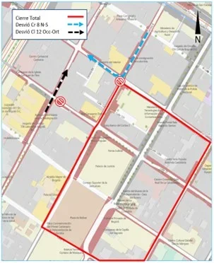 El segundo punto clave en Bogotá es la Plaza de Bolívar, donde queda la Alcaldía, el Palacio de Justicia, la Casa de Nariño y el Capitolio. Habrá cierres en la carrera 8 entre calles 12B y calle 10; carrera 9 entre calles 12B y calle 10. Esto, desde las 6:00 p.m. del 7 de marzo hasta las 8:00 p.m. del 8 de marzo.