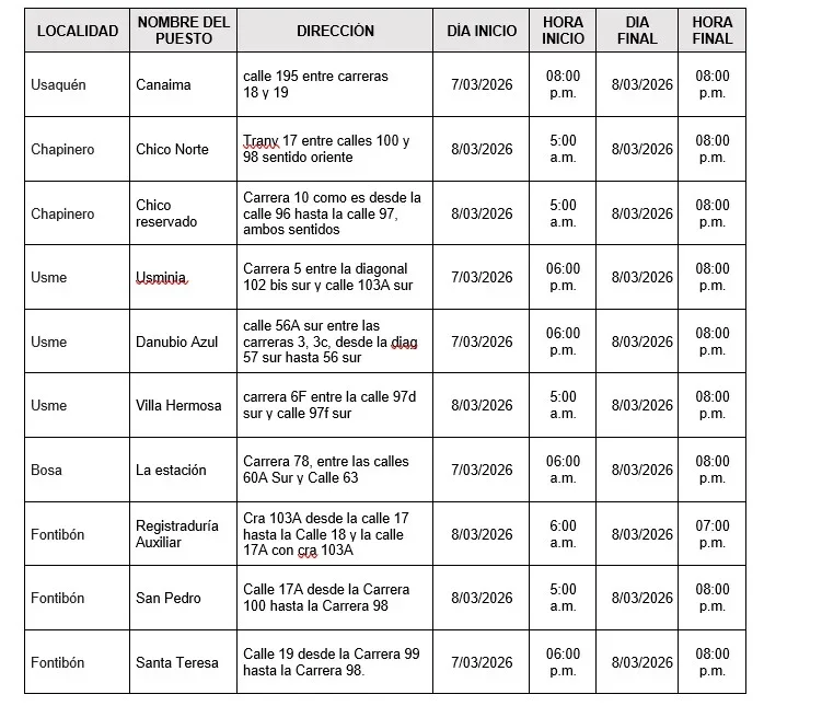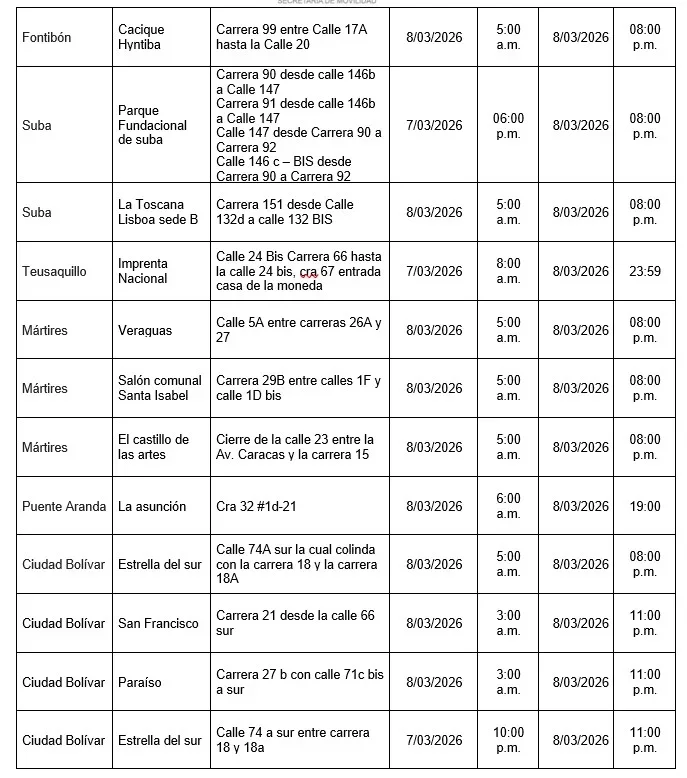 Entre las 3:00 p.m. del 8 de marzo hasta la 1:00 p.m. del 9 de marzo, habrá cierres en la calzada norte de la avenida Esperanza entre Américas y carrera 40, calle 25 entre carreras 37 y 40, carrera 37 entre avenida Esperanza y calle 25; y carrera 40 calzada oriental entre Américas y calle 25.