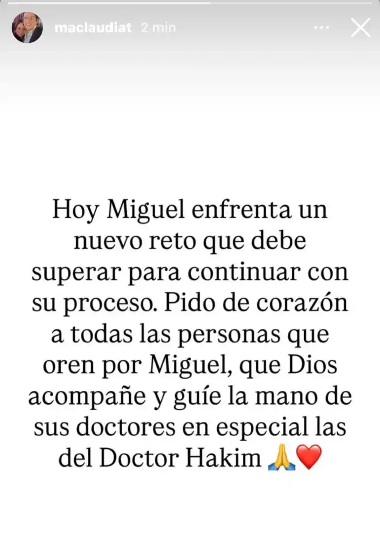 Miguel enfrenta un nuevo reto que debe superar para continuar con su proceso. Pido de corazón a todas las personas que oren por Miguel, que Dios acompañe y guíe la mano de sus doctores, en especial las del doctor Hakim.