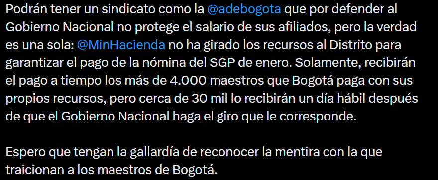 A través de redes sociales, la secretaria de Educación de Bogotá, Isabel Segovia, dio a conocer una grave situación que afecta a los docentes. El Gobierno no habría girado los recursos del Sistema General de Participaciones (SGP) a tiempo para pagarles la nómina.