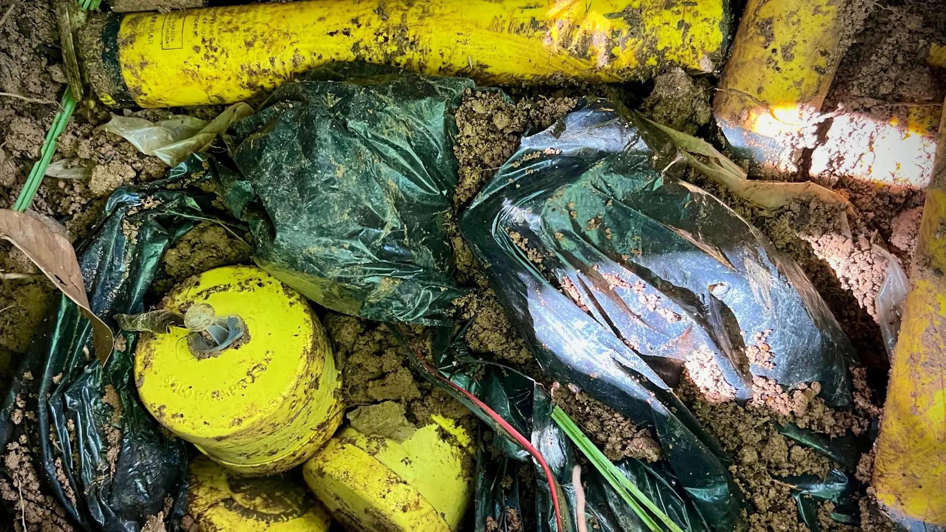 El hallazgo tuvo lugar en la vereda Laureles, donde se encontraron siete minas antipersonales, cuatro artefactos explosivos improvisados similares a granadas de mortero de 60 mm, seis bengalas de iluminación, dos trampas de iluminación, cuatro chalecos pixelados y un radio Motorola con alcance de dos metros.