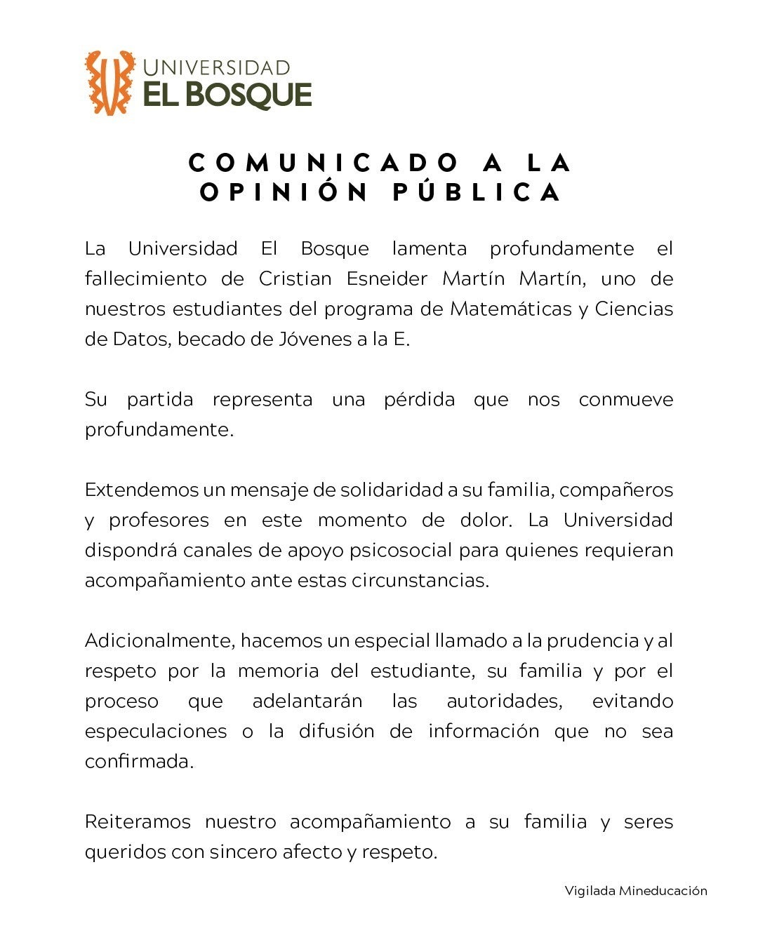 Al parecer, el joven había salido con rumbo a la Universidad El Bosque, en Bogotá, en donde empezaba a cursar sus estudios de Matemáticas y Ciencias de Datos.