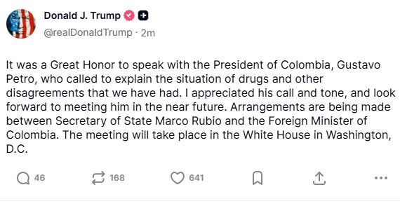 Trump añadió que valoró el tono de la conversación y manifestó su interés en concretar un encuentro presencial “en un futuro cercano”. También indicó que ya se están haciendo coordinaciones entre el secretario de Estado, Marco Rubio, y el canciller colombiano para realizar una reunión oficial en la Casa Blanca, en Washington D.C.