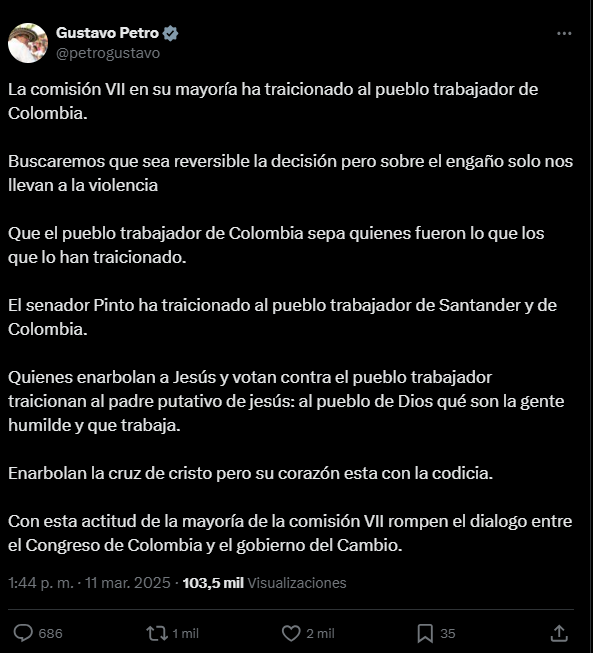 A través de su cuenta de X, el mandatario expresó su descontento con la decisión y señaló directamente a los congresistas que promovieron la ponencia negativa. "La Comisión VII en su mayoría ha traicionado al pueblo trabajador de Colombia", afirmó Petro, quien insistió en que la determinación tomada por el Senado pone en riesgo los derechos laborales que el Gobierno buscaba garantizar.