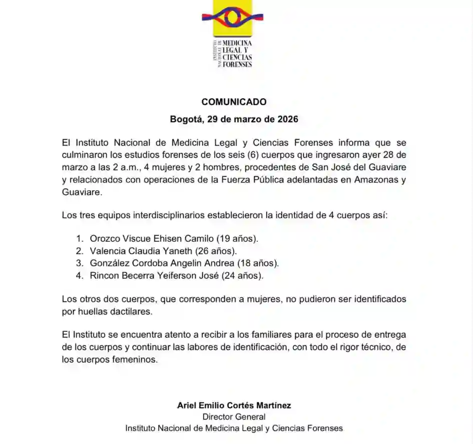 El Instituto Nacional de Medicina Legal y Ciencias Forenses informa que se culminaron los estudios forenses de los seis (6) cuerpos que ingresaron ayer 28 de marzo a las 2 a. m., 4 mujeres y 2 hombres, procedentes de San José del Guaviare y relacionados con operaciones de la Fuerza Pública adelantadas en Amazonas y Guaviare.