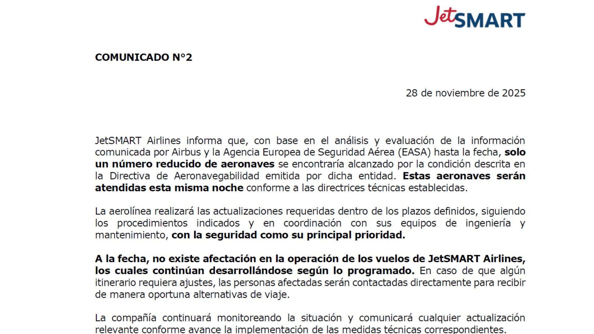 A través de un comunicado oficial, la aerolínea señaló que, tras el análisis de la información entregada por Airbus y la Agencia Europea de Seguridad Aérea (EASA), “solo un número reducido de aeronaves se encontraría alcanzado por la condición descrita en la Directiva de Aeronavegabilidad”.
