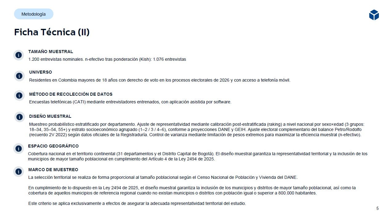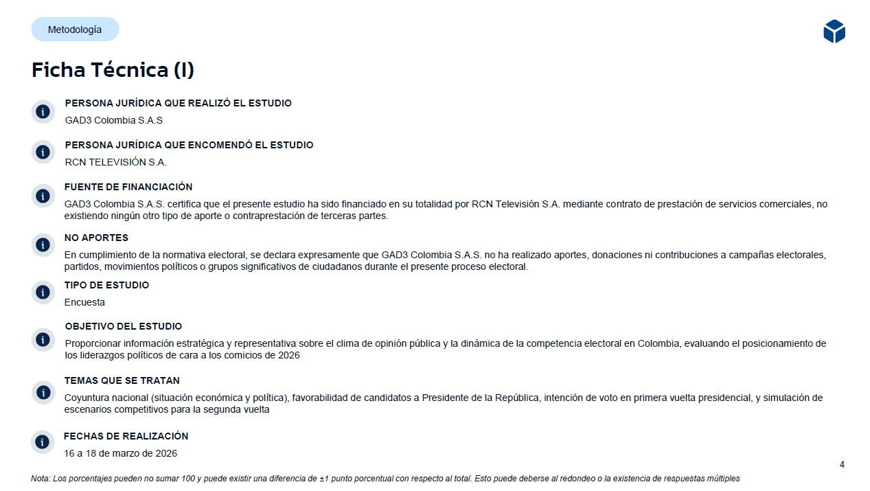 Luego de las elecciones legislativas y consultas del 8 de marzo, GAD3 realizó una encuesta para Noticias RCN sobre la intención de voto de los colombianos de cara a la primera vuelta presidencial que se realizará el 31 de mayo de 2026.