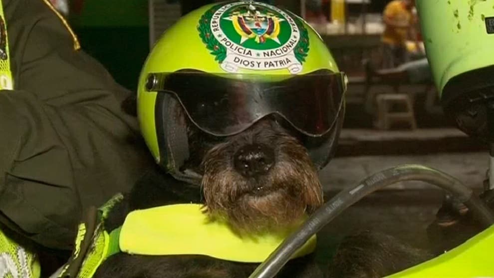 Luce un casco de seguridad, lentes de sol y sus charreteras como Sargento Mayor en el chaleco de policía, ‘Ñero’, como bautizaron al perro, se trepa a la moto con agilidad felina o mejor dicho perruna, y sale a cumplir su misión.