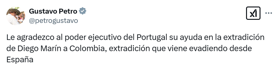 El pasado 9 de febrero en la red social X, el mandatario colombiano se había referido a la extradición de Diego Marín, quien está detenido en Portugal desde hace dos meses.