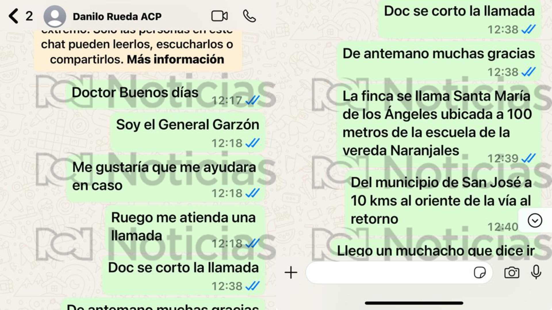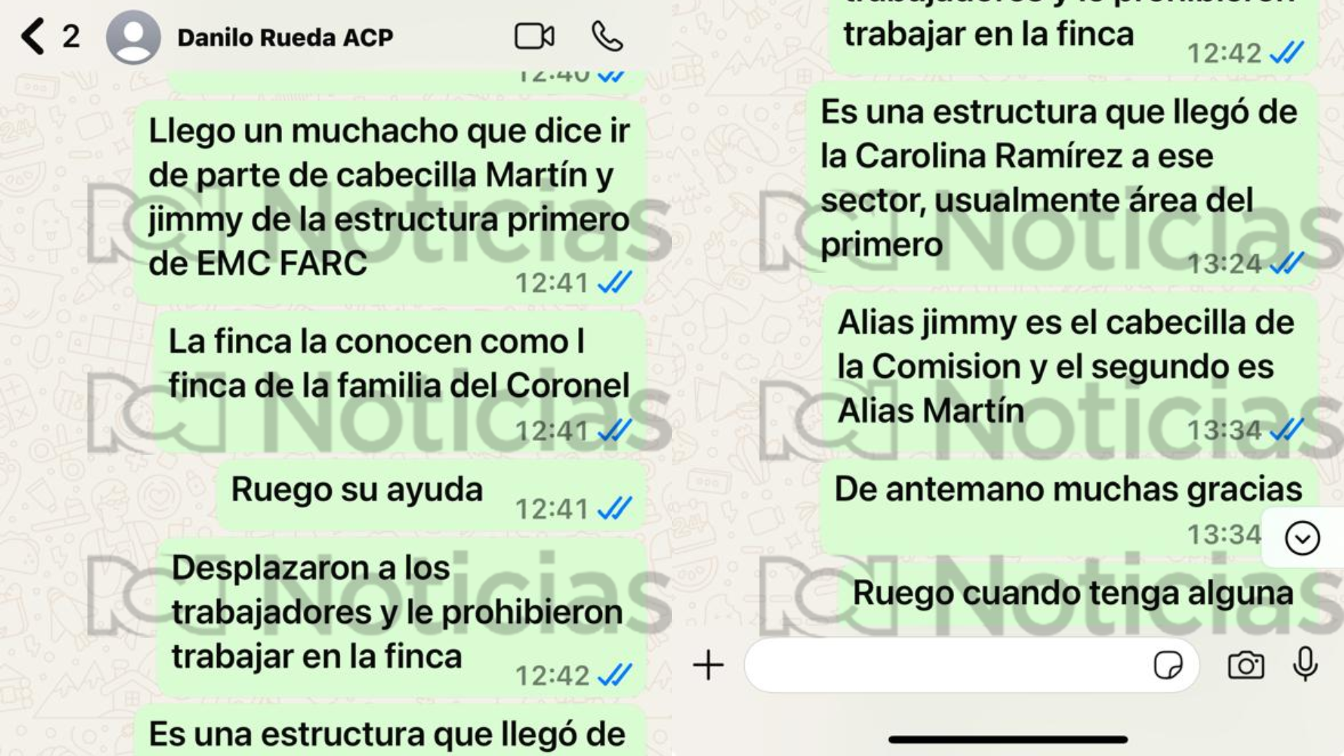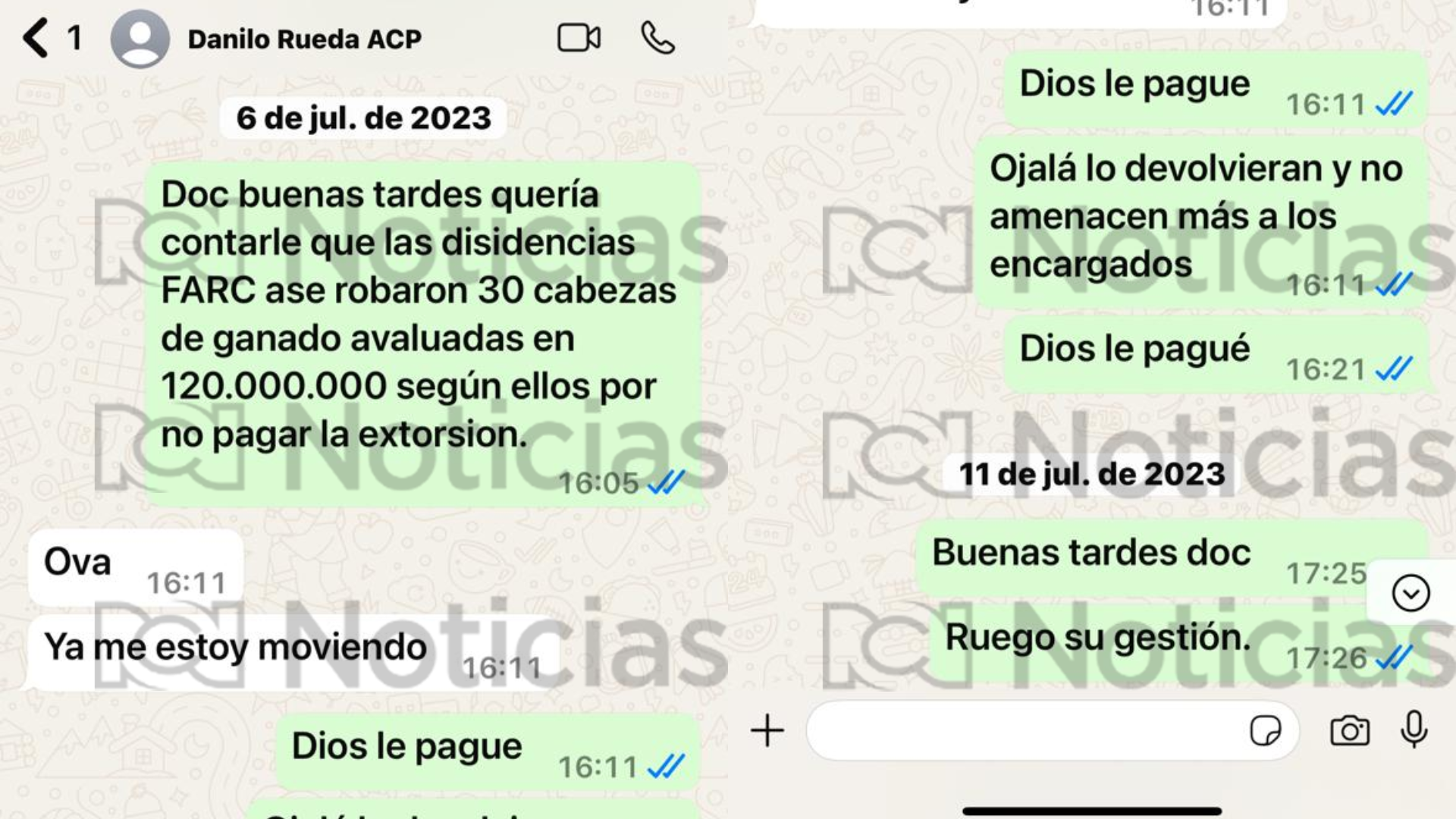 “Las disidencias Farc se robaron 30 cabezas de ganado avaluadas en 120.000.000, según ellos por no pagar la extorsión”. A lo que Rueda responde “ya me estoy moviendo”.