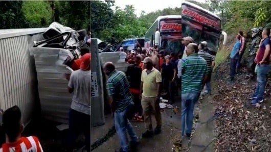 Un camión tipo furgón chocó contra un bus que transportaba hinchas del Junior de Barranquilla en la vía que de conduce de Puerto Araujo a Cimitarra, en Santander.