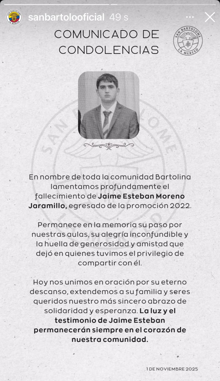 Entretanto, el Colegio San Bartolomé La Merced, institución en la que el joven cursó su bachillerato, también se pronunció y expresó su profundo dolor por el fallecimiento del egresado de la promoción 2022.