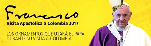El papa Francisco estará en Colombia del 6 al 10 de septiembre. Visitará Bogotá, Medellín, Cartagena y Villavicencio. Lo ornamentos litúrgicos que usará en las eucaristías son de producción colombiana elaborados por artesanos del Valle del Cauca, Putumayo, La Guajira y Bogotá..