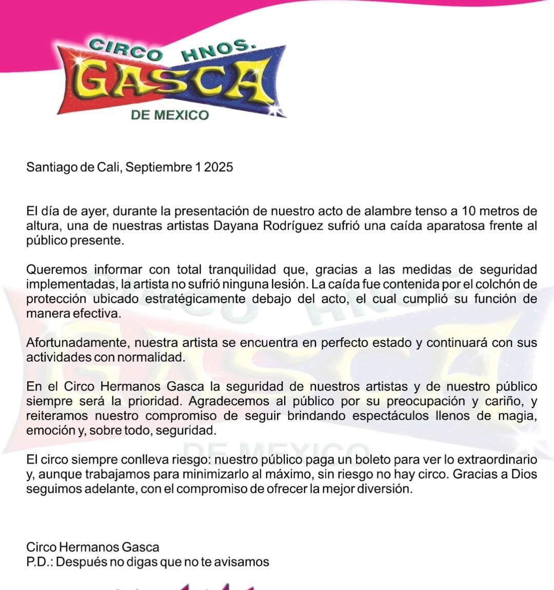 Finalmente, la compañía reiteró: “En el Circo Hermanos Gasca la seguridad de nuestros artistas y de nuestro público siempre será la prioridad. Agradecemos al público por su preocupación y cariño”.