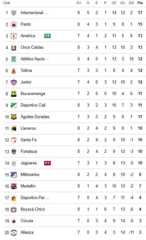 Tras los triunfos de América, Santa Fe y Águilas Doradas, así quedó la tabla de posiciones del fútbol colombiano.
