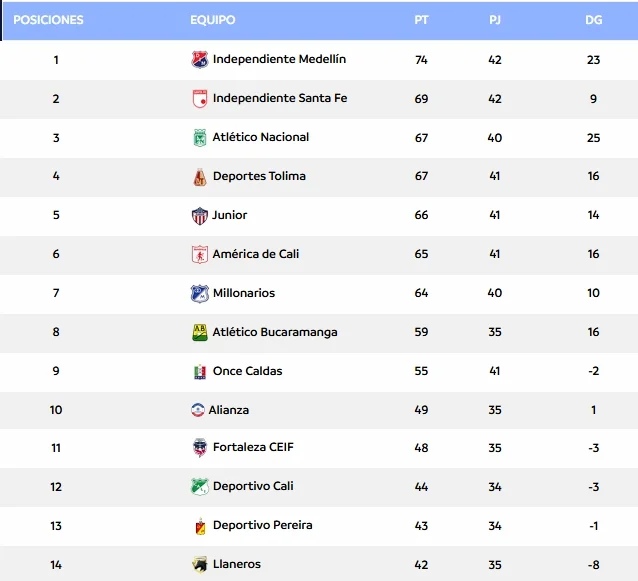 Así está la tabla de reclasificación previo a los partidos de Nacional y Millonarios en la Liga BetPlay