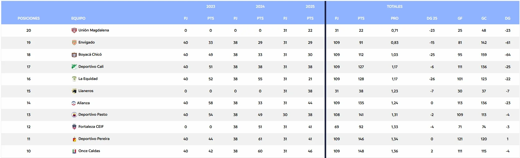 Hay movimientos en la tabla del descenso del fútbol colombiano. Luego de que se disputara la fecha 11 de la Liga BetPlay, los equipos que están en riesgo de caer a la segunda división hacen cuentas tras unos resultados que favorecen al Deportivo Cali.