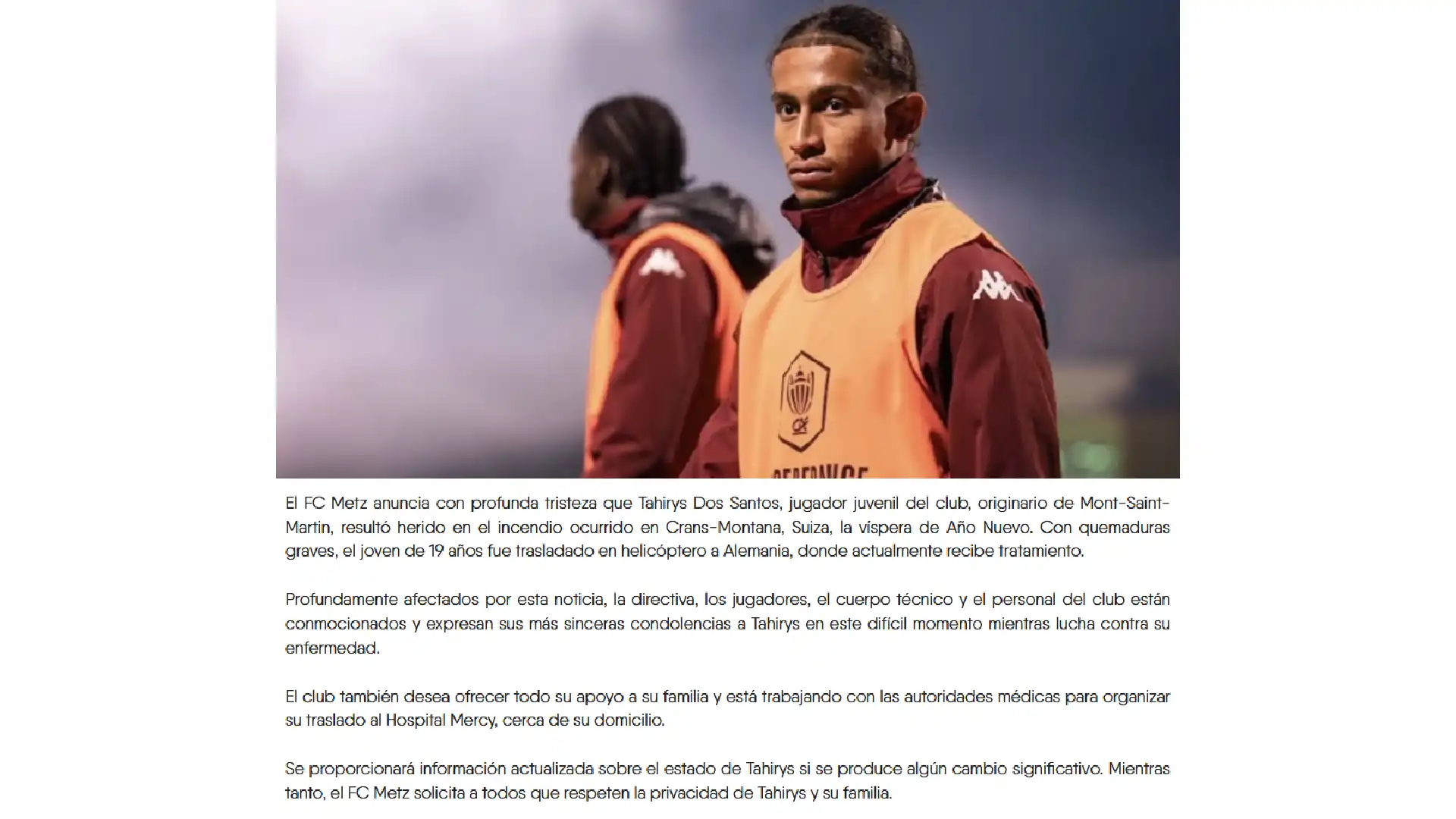 Tras el devastador incendio ocurrido durante la madrugada del 1 de enero en el exclusivo bar-discoteca Le Constellation, ubicado en la estación de esquí de Crans-Montana, se ha revelado la identidad de uno de los heridos que lucha por su vida: se trata de Tahirys Dos Santos, una de las promesas del fútbol francés.