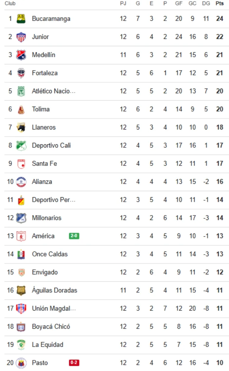 Tras este triunfo de América, solamente queda un compromiso pendiente entre Independiente Medellín y Águilas Doradas. Con los otros 18 equipos ya con las 12 fechas disputadas, así quedó la tabla de posiciones.