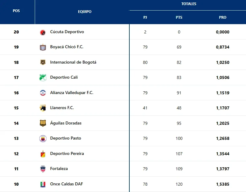 Cúcuta sigue en la casilla 20, al no tener ningún punto en dos partidos jugados. Boyacá Chicó está en el puesto 19 con un promedio de 0,8734 muy difícil de remontar y luego está Internacional de Bogotá con 1,0250, producto de 82 puntos en 80 juegos.