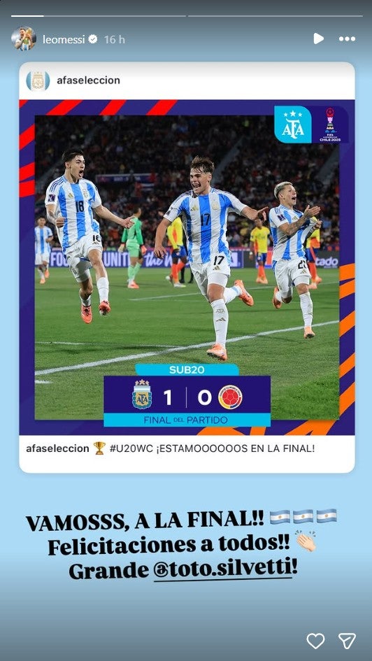 A través de sus redes sociales, donde reúne más de 500 millones de seguidores en todo el mundo, Lionel Messi compartió un mensaje breve pero lleno de orgullo y emoción. “Vamos, a la final!! Felicitaciones a todos!! Grande ‘Toto’ Silvetti!!”, escribió el capitán de la selección mayor, destacando especialmente al delantero argentino que marcó el gol de la clasificación.