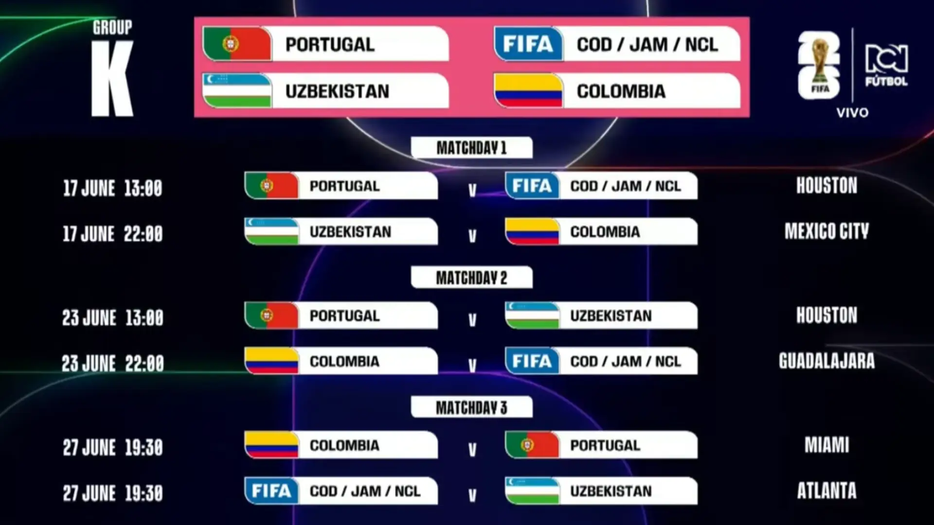 La Selección Colombia debutará en el estadio con mayor capacidad del Mundial, jugando en el estadio Azteca en Ciudad de México frente a Uzbekistán. Posteriormente, repetirá en México, esta vez en el estadio de Chivas de Guadalajara, frente al equipo ganador del repechaje internacional.