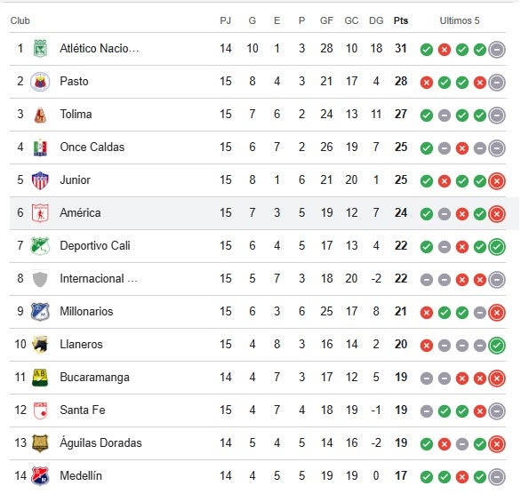 Atlético Nacional se sostiene como líder absoluto con 31 puntos y, además, con la tranquilidad de haber asegurado anticipadamente su lugar en los playoffs. El cuadro verdolaga, que incluso cuenta con un partido menos frente a varios de sus perseguidores, se perfila como el gran favorito para cerrar en lo más alto de la tabla. Muy cerca aparece Deportivo Pasto con 28 unidades, mientras que Deportes Tolima completa el podio con 27 puntos, demostrando una regularidad que lo mantiene firme en la pelea por ser cabeza de serie.