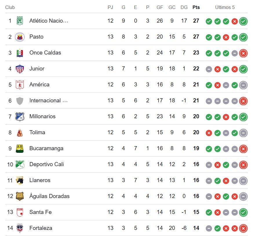 La clasificación refleja un campeonato altamente competitivo. Atlético Nacional lidera con 27 puntos, pero no tiene un margen amplio de tranquilidad. En contraste, Deportes Tolima cierra parcialmente el grupo de los ocho con 20 unidades, lo que significa que apenas siete puntos separan al primero del octavo.