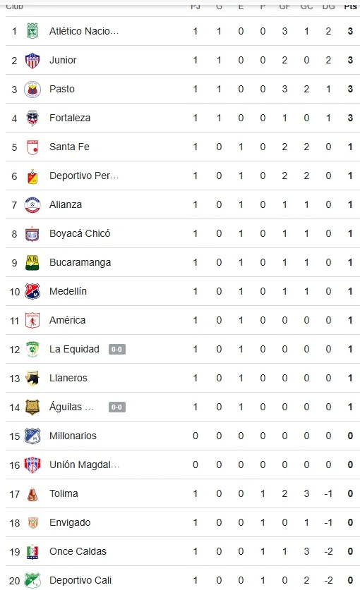 El primer líder del fútbol colombiano al cabo de la primera fecha es Atlético Nacional producto de su triunfo en Manizales ante Once Caldas. Junior, Pasto y Fortaleza pelean el co-liderato al ser los únicos clubes que sumaron de a tres puntos en el debut liguero.