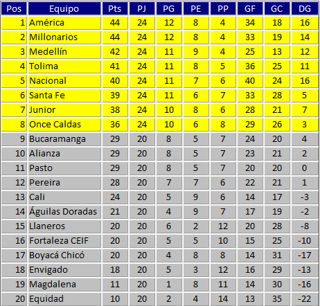 Más abajo se encuentra Atlético Nacional (40), Santa Fe (39) y Junior (38). el que cierra la tabla es el Once Caldas con (36).
