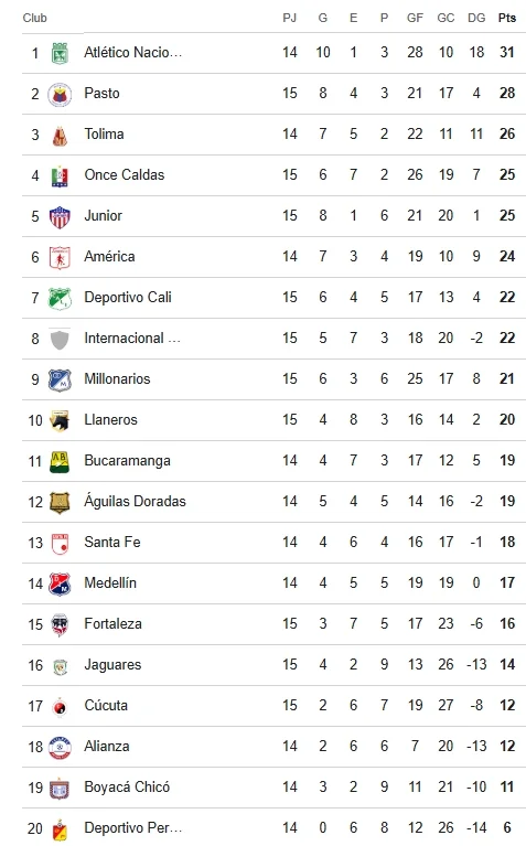 - Atlético Nacional - 31 puntos
