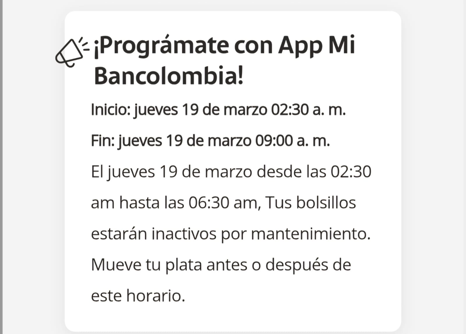 La entidad comunicó a sus clientes: “El jueves 19 de marzo desde las 02:30 a. m. hasta las 06:30 a. m., tus bolsillos estarán inactivos por mantenimiento. Mueve tu plata antes o después de este horario”.