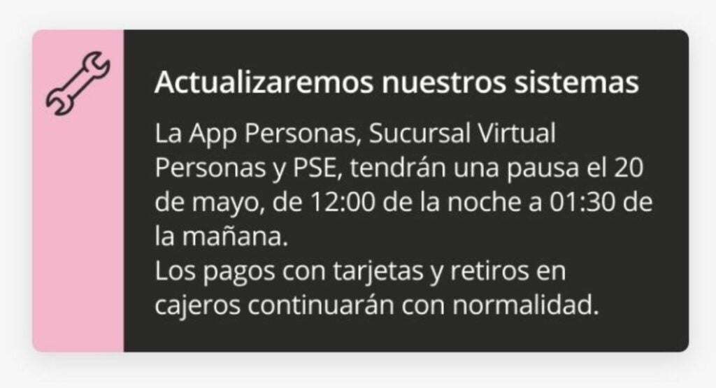 El banco más grande de Colombia ha informado que estas actualizaciones ocasionarán una interrupción temporal entre las 12:00 p.m. y las 1:30 am del próximo 20 de mayo.