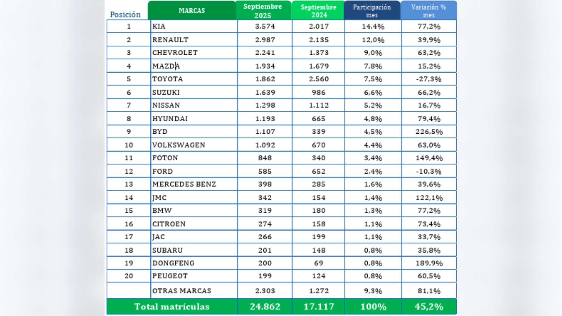 Entre enero y septiembre las participaciones por línea fueron: Toyota Corolla Cross con el 3,9%, Kia K3 con el 3,9%, Renault Duster con el 3,4%, Mazda Cx-30 con el 3,4% y Kia Picanto con el 2,7% del mercado, ocupando los cinco primeros lugares de matrículas en el país; estas cinco líneas representaron el 17,3% del total matriculado en lo que va corrido del año 2025.