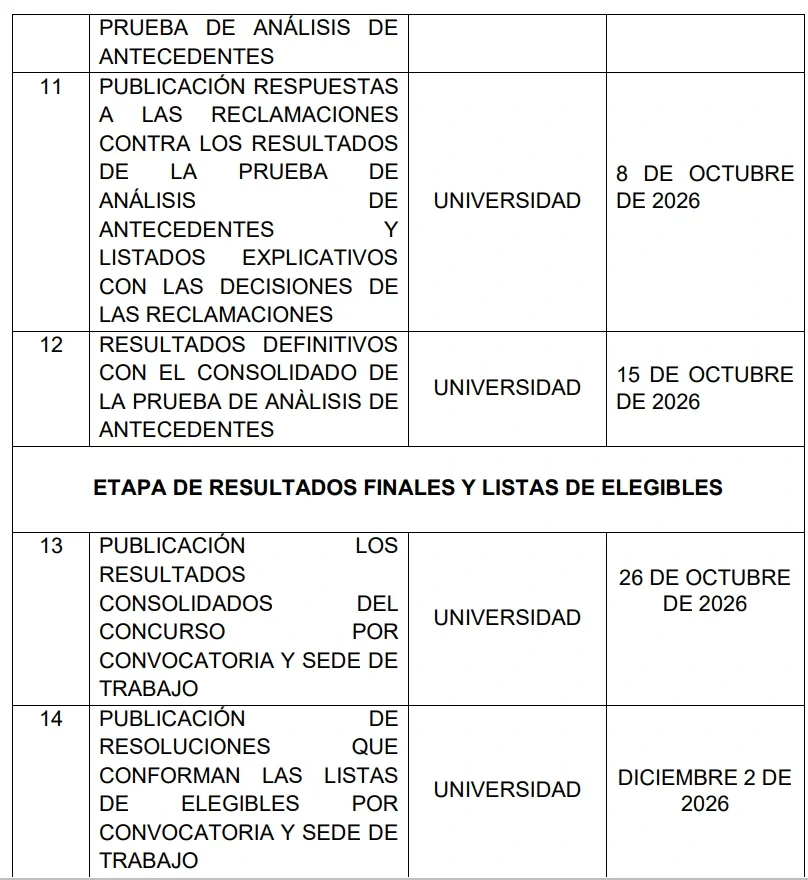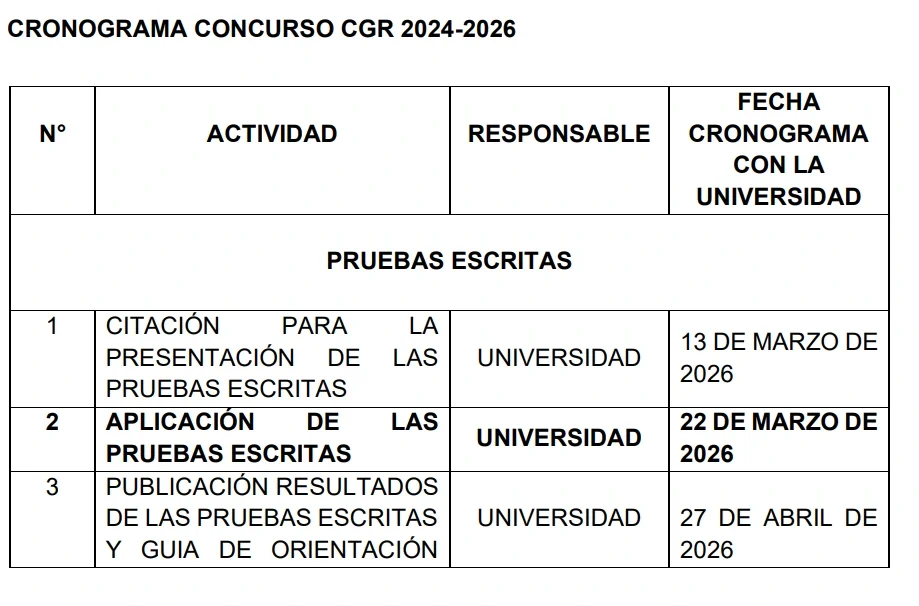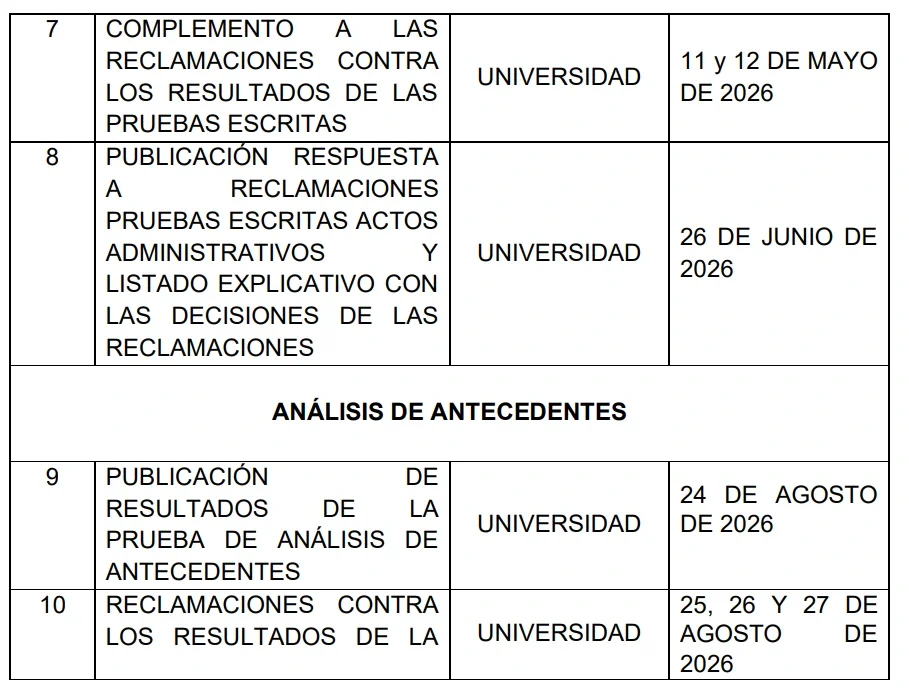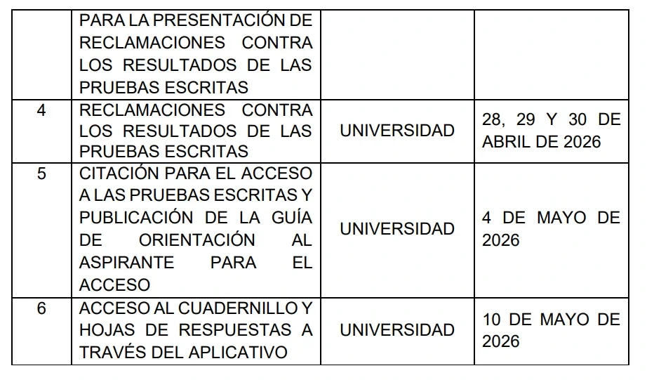 Con el nuevo cronograma, la citación quedó fijada para el 13 de marzo de 2026. La prueba se llevará a cabo el 22 de marzo y la publicación de los resultados será el 27 de abril. Asimismo, las reclamaciones se responderán entre el 28, 29 y 30 de abril.