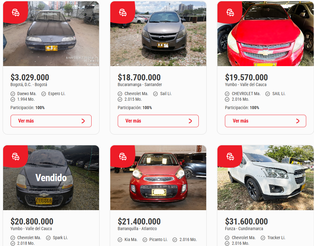 El gran beneficio de estos remates es que los precios son considerablemente más bajos que los habituales. En la lista actual de Davivienda aparecen vehículos ubicados en diferentes ciudades del país como Bogotá, Barranquilla y Cartagena.