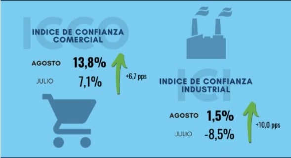 En agosto, el índice de confianza comercial se ubicó en 13,8%, lo que representa un aumento de 6,7 puntos porcentuales frente al mes anterior. Según el centro de pensamiento económico este incremento se explica principalmente por un aumento de la situación económica actual de la empresa y de las expectativas de situación económica para el próximo semestre.