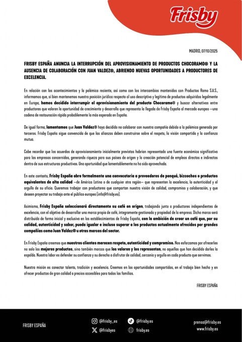 El comunicado también confirmó que la cadena de café Juan Valdez rechazó colaborar con Frisby España.