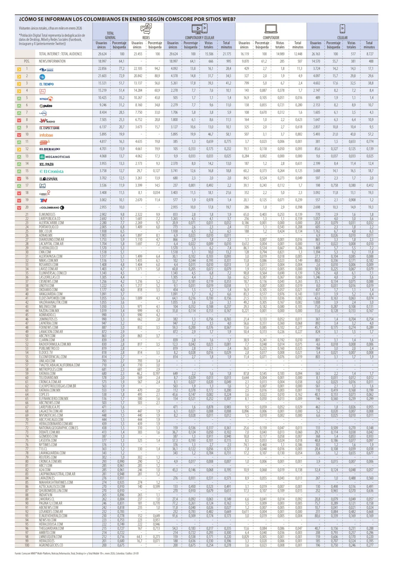 En el listado general correspondiente al primer mes del año, Caracol Next lidera con 24,70 millones de usuarios únicos, seguido muy de cerca por RCN 360, que alcanzó 24,34 millones. En la tercera posición aparece TelevisaUnivisión Digital, con 23,58 millones de usuarios.