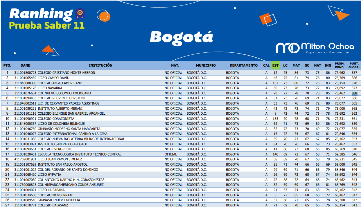De acuerdo con el análisis publicado por Milton Ochoa, expertos en evaluación, la capital cuenta con más de 390 colegios públicos que presentaron la prueba.