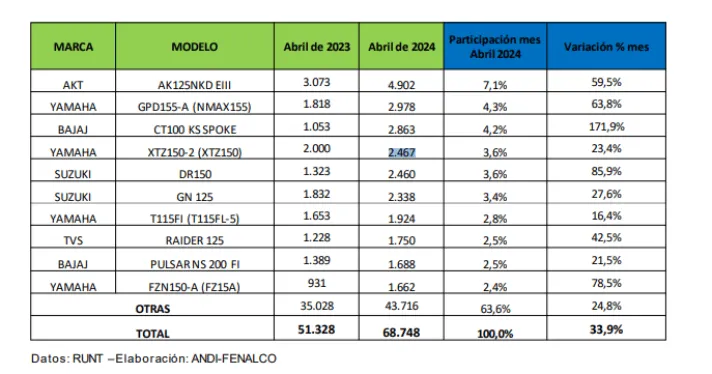 Yamaha fue la marca que lideró el ranking de ventas con 13.735 unidades, lo que significa el 20% de participación. Le siguió AKT con 11.230 unidades y en tercer lugar está Bajaj con 10.306 motocicletas.