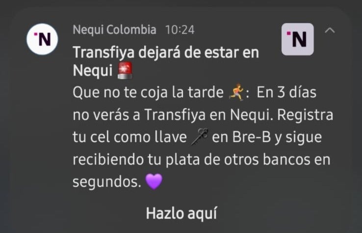 En un mensaje dentro de la aplicación, Nequi fue claro: “En 3 días no verás a Transfiya en Nequi. Registra tu cel como llave en Bre-B y sigue recibiendo tu plata de otros bancos en segundos”.