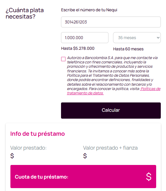 El usuario debe contar con un seguro de vida obligatorio y cumplir con las políticas de aprobación de la entidad. A través del portal de Nequi es posible usar un simulador de crédito, en el que basta con ingresar el número de teléfono, el monto a solicitar y el tiempo de pago.