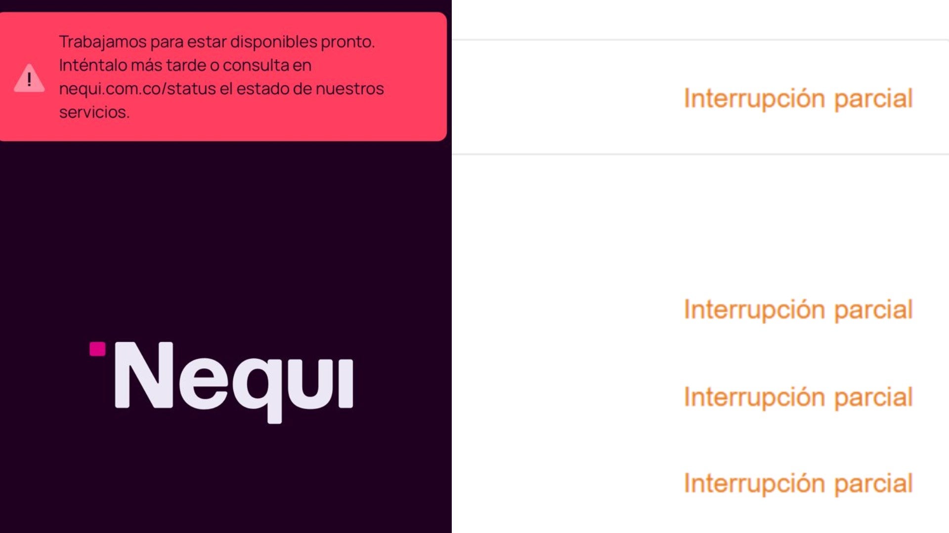 Entre los servicios que se encuentran suspendidos, Nequi informó que desde el ingreso a la app hasta la realización de transferencias y retiros tienen interrupciones parciales y mayores.