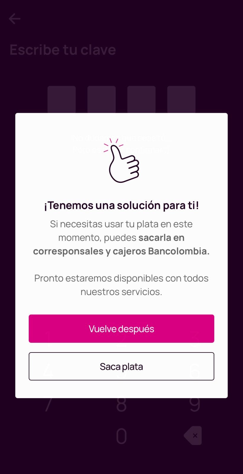 "Tenemos una solución para ti. Si necesitas usar tu plata en este momento, puedes sacarla en corresponsales y cajeros Bancolombia", detalló Nequi en su aplicación.